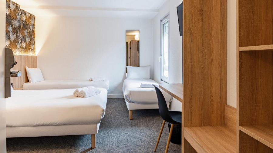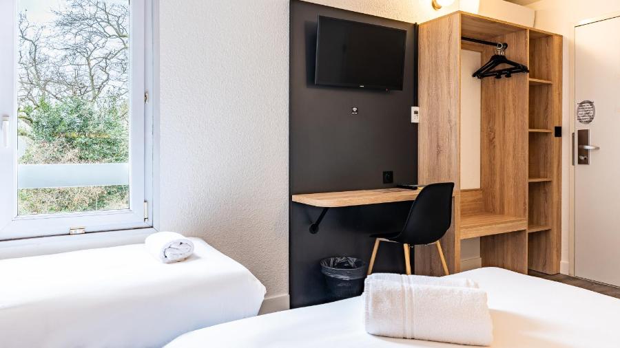 The 59 rooms provide a simple and well-thought-out setting to guarantee a restful night. Whether traveling alone, as a couple, or as a family, several configurations are available, with double beds, twin beds, or family rooms equipped with bunk beds. Careful soundproofing maintains the tranquility of the premises, while quality bedding contributes to restorative sleep. Each room is equipped with a desk, a flat-screen TV with Canal+ and Canalsat channels, as well as free high-speed Wi-Fi, allowing everyone to stay connected or work with ease.